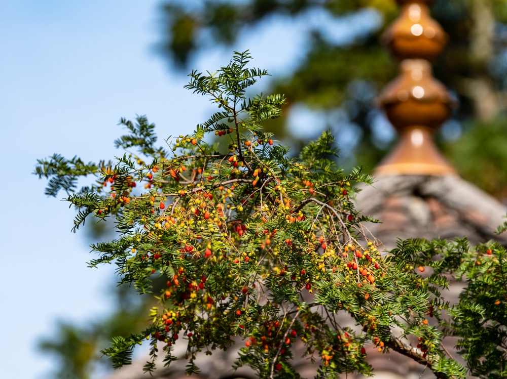 10月29日,在貴州省從江縣谷坪鄉(xiāng)銀下侗寨拍攝的國家一級珍稀瀕危物種野生紅豆杉果實。深秋時節(jié),貴州省黔東南苗族侗族自治州從江縣谷坪鄉(xiāng)銀下侗寨的百年紅豆杉果實紅遍枝頭,晶瑩剔透的紅色果實與古樸的侗寨建筑交相輝映,勾勒出一幅靜謐秀美的侗鄉(xiāng)畫卷。近年來,該村的古樹名木得到了很好的保護,在銀下村的四周山嶺上集群生長了147株紅豆杉,。